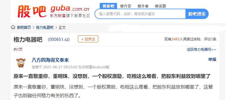 “原来一直敬重你,董明珠,没想到,一个股权激励,吃相这么难看,把股东利益放到哪里了,这辈子也别碰任何格力有关的东西了。”股民“八方四海得文泰来”6月21日早晨在格力电器的股吧里发泄着自己的不满。