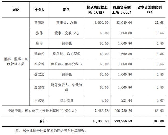 根据《员工持股计划(草案)》,格力电器本次员工持股计划的资金规模不超过30亿元。拟参与本次员工持股计划的员工总人数不超过12000人,包括公司董事(不含独立董事)、监事、高级管理人员共计8人,以及对公司整体业绩和中长期发展具有重要作用的中层干部和核心员工。