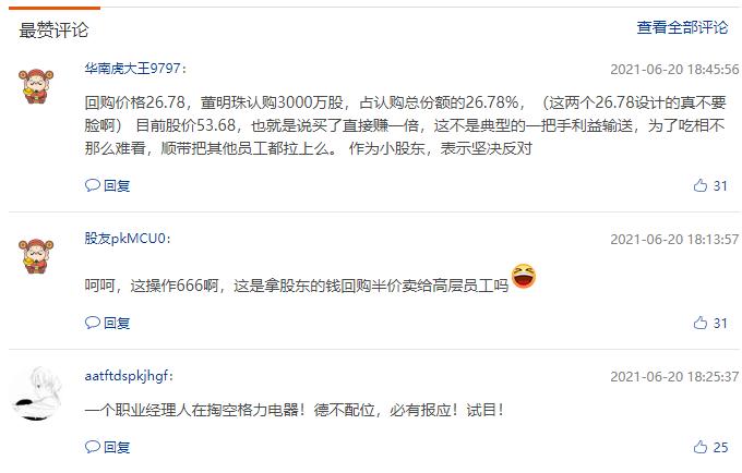 格力公告,1.2万员工半价认购1.08亿股,有股民将此举形容为“拿股东的钱回购股票,半价卖给格力高层”。