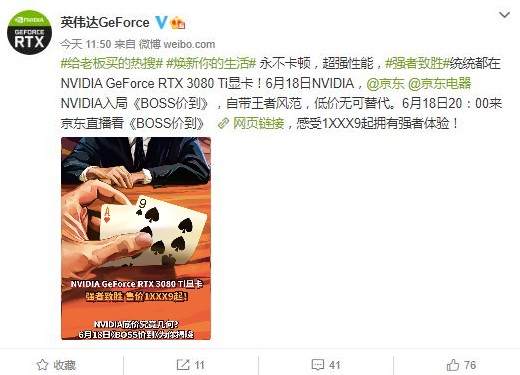 在全球显卡巨头英伟达(NVIDIA)618期间的的微博广告中,英伟达甚至亲自将原价8999元的RTX 3080 Ti显卡标上了1XXX9元的价格,被玩家怒斥为「官方黄牛」,一路骂到删帖。
