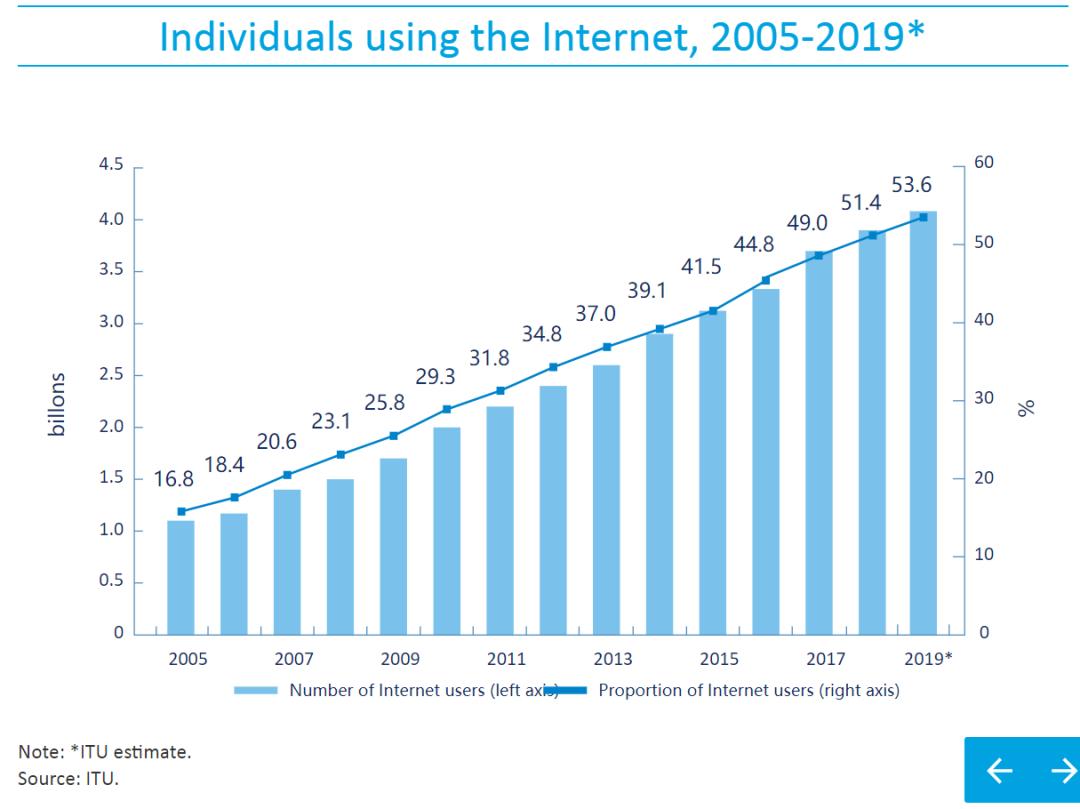 数据来源:ITU官网全球个人用户网络使用占比(2005--2019)