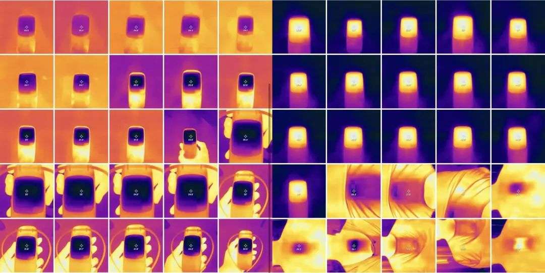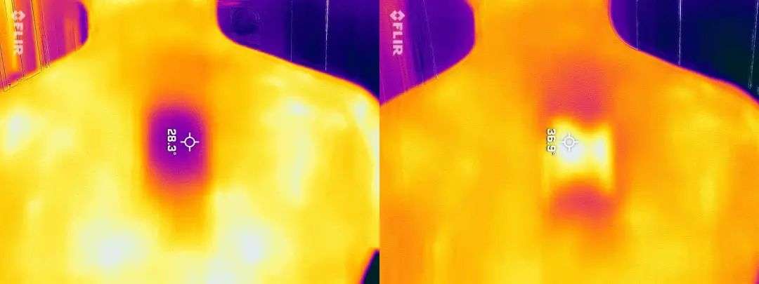 首先,通过热成像仪可以发现,无论是制冷还是制热,整个后背只有机身接触到的区域,有明显的温度变化。