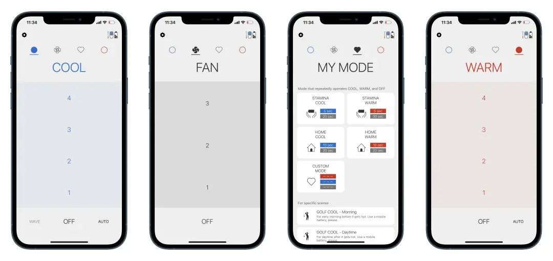 通过蓝牙与手机连接后,就能在 app 上控制 Reon Pocket 2 工作了。制冷、制热分别有四个档位。风扇模式有三档风速可调。