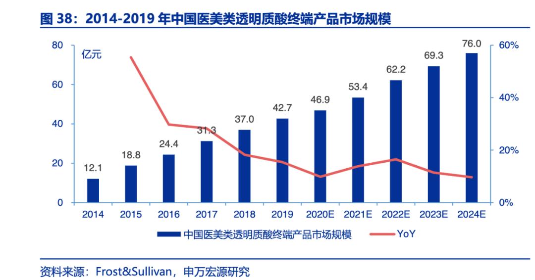 孙强表示,2019年,国内医美玻尿酸市场约43亿元,预计未来5年复合增速为12.8%,2023年市场规模接近70亿元。按照券商测算,爱美客2023年的平均收入将达到24.48亿元。假设以上数据都能实现,那么2023年爱美客的市场份额将扩大至35%。