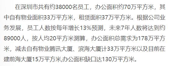 减去自有物业腾讯大厦、滨海大厦计33万平方米,还有目前在建前海大厦15万平方米,还得130万平方米办公面积才满足需求。