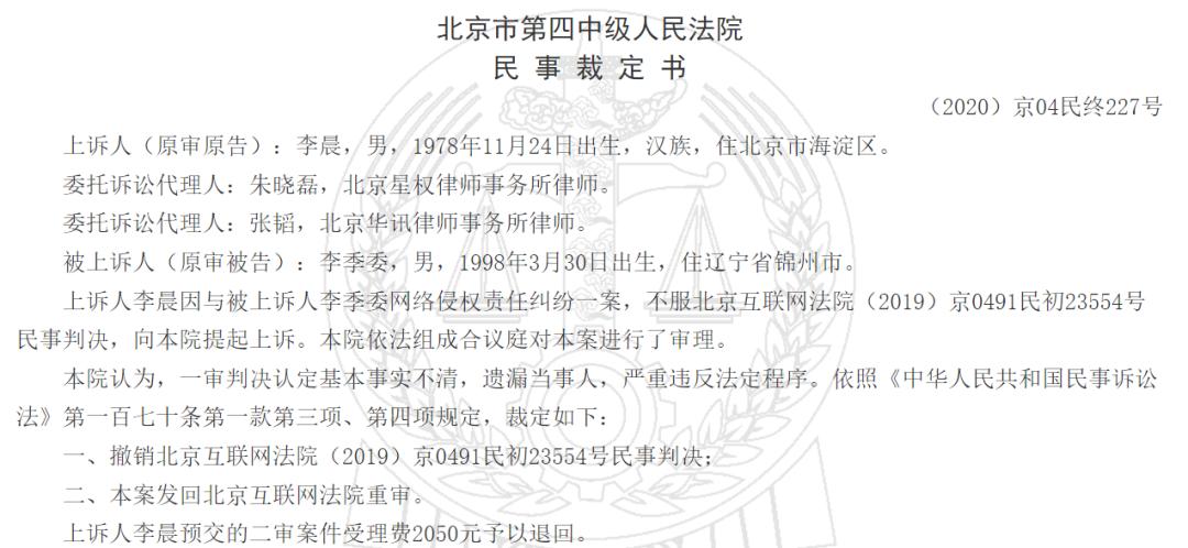 但这场“网友的胜利”并未持续太久。很快李晨委托诉讼方星权律所表示将提起上诉,北京第四人民法院做出二审判决:一审判决认定基本事实不清,遗漏当事人,严重违反法定程序,撤销北京互联网法院判决结果并发回重审。目前该案仍在重审中。