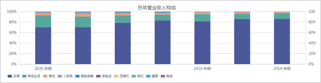 进一步展开,尽管格力电器涉足空调、冰箱、洗衣机、热水器、厨房电器等众多家电领域,但根据2020年的年报,空调依然是决定公司命运的单品,营收占比达到70.08%。