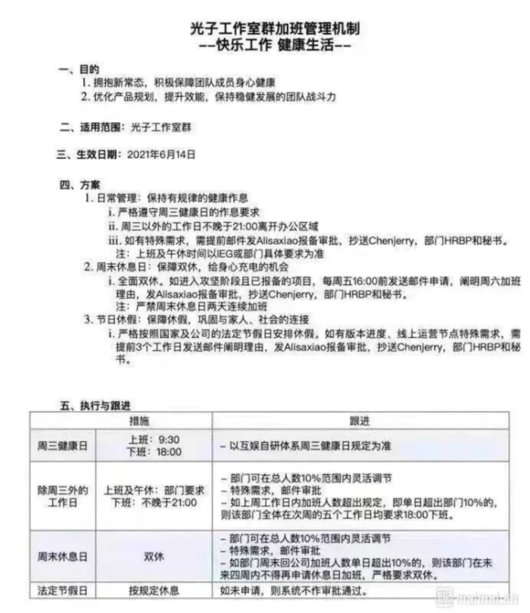 上周,一份腾讯光子工作室群加班管理机制的文件在各大社交平台流传开来,文件中明确规定每周三为健康日,早上9点半上班,晚上6点下班。同时,工作室要全面保障双休日和法定节假日休息,加班需要提前报批,双休日不可连续加班。这一新规流出之后,立即引发了全网的震动,包括了上面这段知乎用户Theodore的高赞回答。