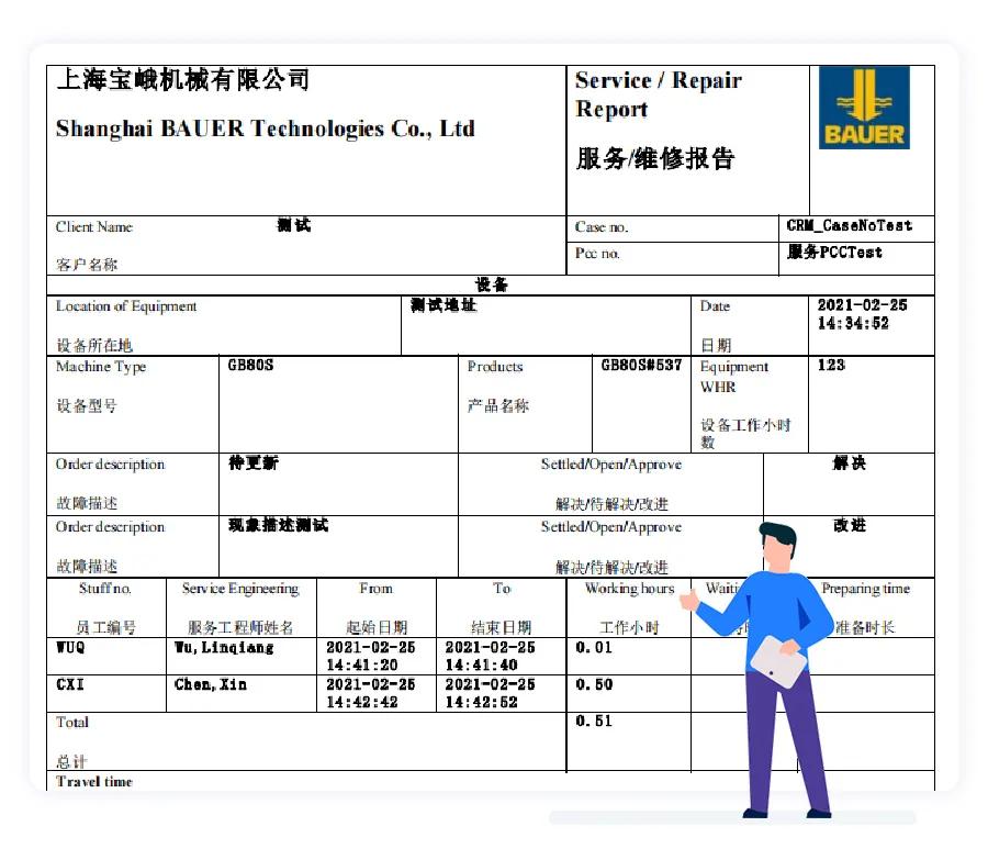 大型工程机械企业,每个工单完工后都会给客户发送一份纸质的服务报告。通常是由服务工程师完工后手动填写2份服务报告,填写完成后由领导签字,然后将其中一份快递发送给客户。