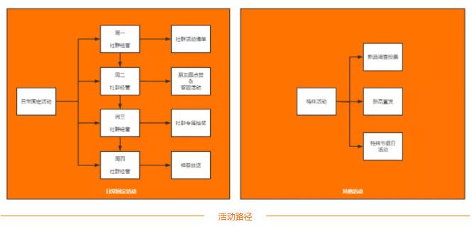 周⼆答题或朋友圈点赞活动,周三会员抽奖/周四神券发放⽇(通过不同的福利活动带动社群活跃和促进社群转化)。