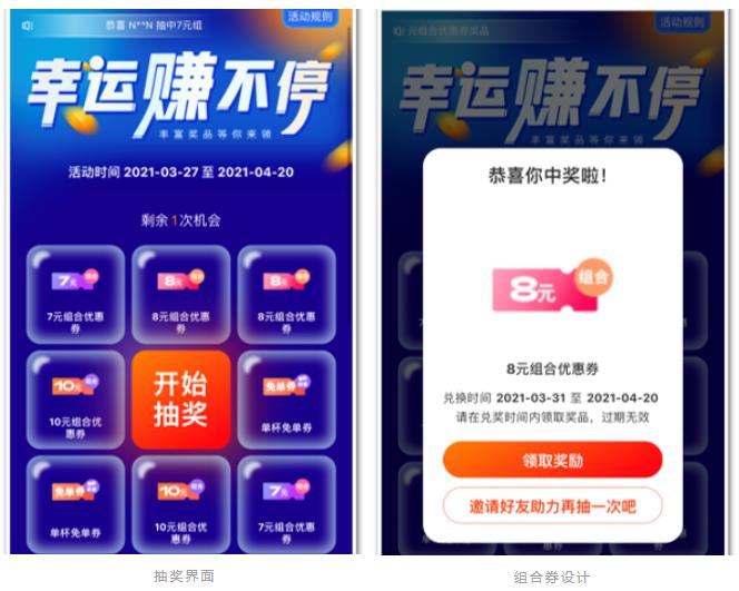 第二个路径是所有参与的顾客,每次抽奖100%能获得组合优惠券。而本次活动所有优惠券,都是下次到店⽅可使⽤,侧向拉动线下⻔店的复购率。
