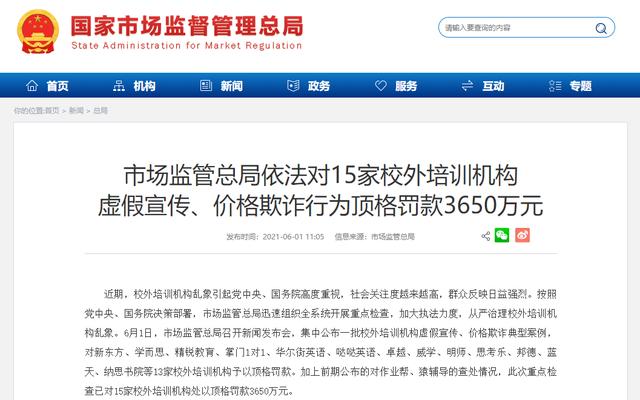 近期,北京市监管部门两次对在线教育机构作顶格罚款处罚,6月1日,国家市场监督管理总局对“学而思”、“猿辅导”、“作业帮”等15家校外培训机构顶格罚款共计3650万元,