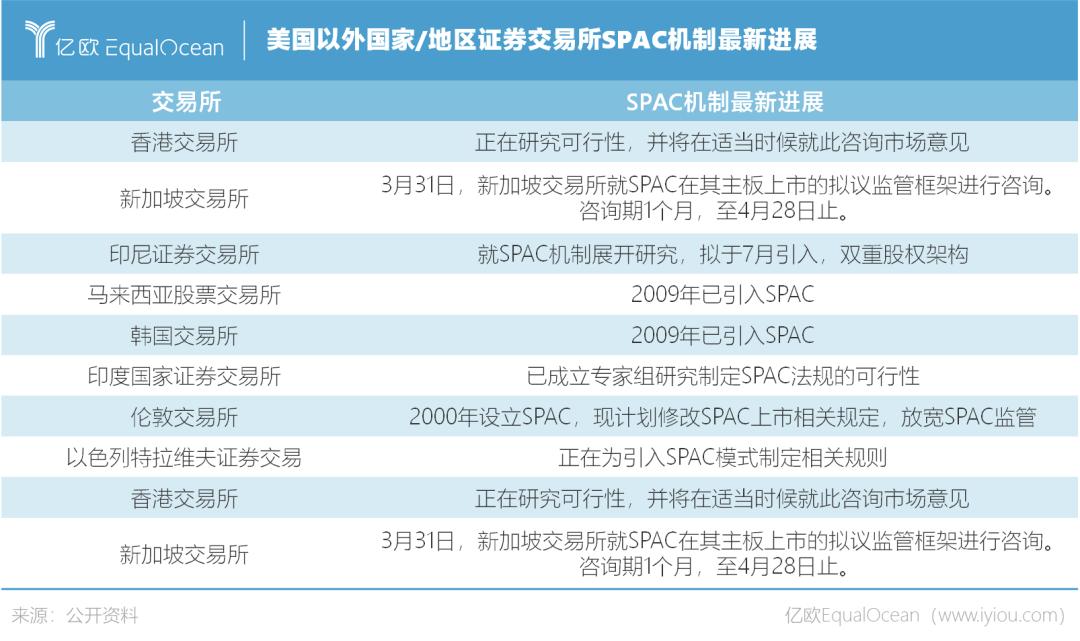 与此同时,为了防止本国优质企业外流,同时加强自身吸引力,全球多家证券交易所也开始研究探讨或已经引入SPAC上市机制。