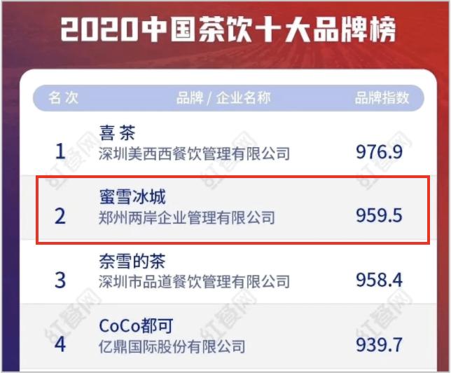 再比如,它的品牌影响力非常强悍,在“2020 中国茶饮十大品牌榜”中名列第二,仅次于喜茶,还反超了 2019 年的第二名奈雪的茶。