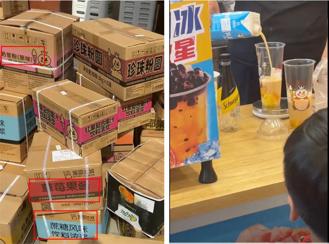 当顾客面往奶茶里倒奶浆(植脂末做的一种奶味制品);