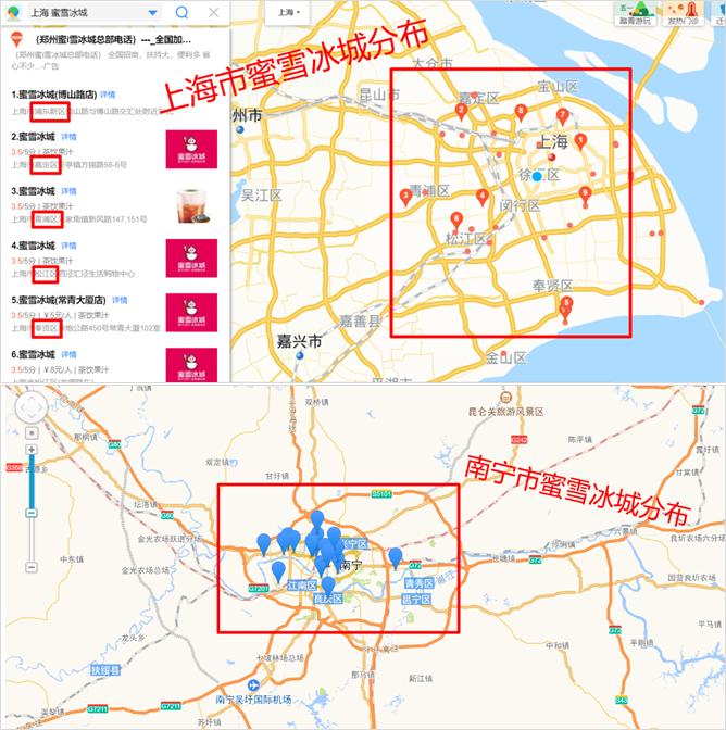 以上海市和广西省南宁市为例,蜜雪冰城在上海的门店屈指可数,而且都零星分散在上海的郊区;