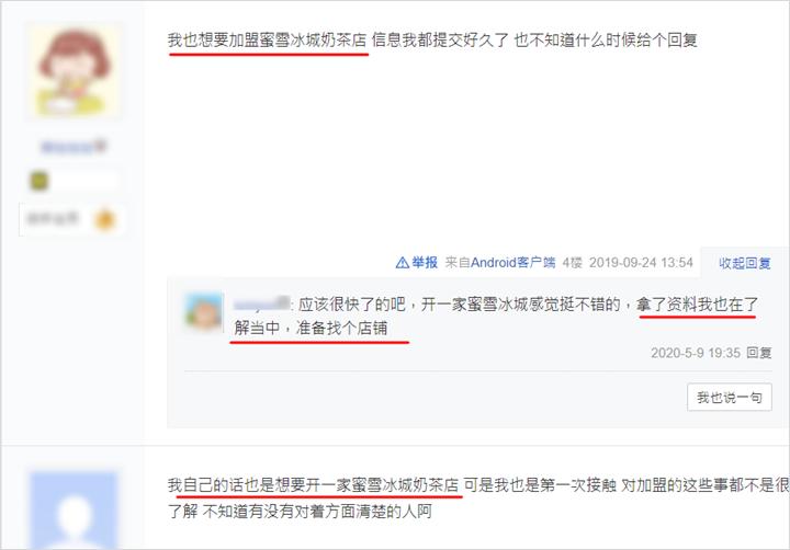 在各大平台随手翻奶茶加盟相关帖子,基本上都能看到有人表示想加盟蜜雪冰城。
