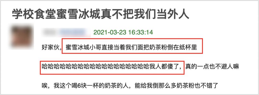 和现在喜欢宣传“鲜果原榨”“杯杯手捣”,用各种高大上概念包装自己的奶茶相比,蜜雪冰城显得格外接地气,一点不避讳自己使用的都是比较便宜的材料,甚至到了“不把用户当外人”的地步: