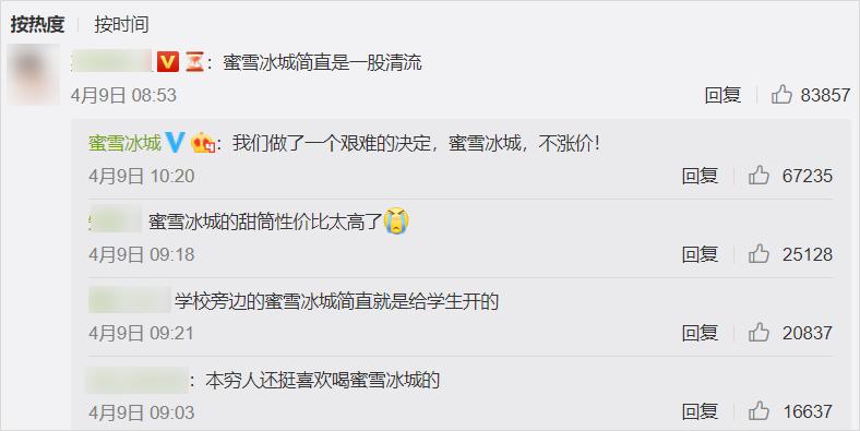 蜜雪冰城的很多爆款产品都是 20 年只涨价 1 元。在这个物价飙升的时代,蜜雪冰城的涨价幅度可以说是很良心了,网友纷纷表示“要支持蜜雪冰城”:
