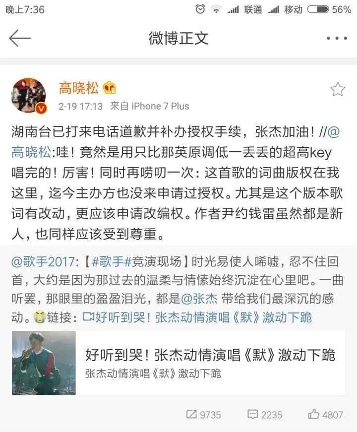 像赵雷、郭顶等拥有很多粉丝的艺人去发声必然会获得更多的关注,或者张亚东、高晓松这样的业内知名音乐制作人在维权声讨后,也会更加受到重视。就比如高晓松作为《默》的版权所有者在微博上一番发言后,立即得到湖南卫视的道歉,并补办了授权手续。