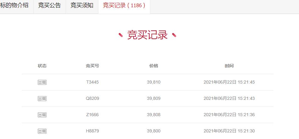 截至发稿,根据拍卖页面显示,这场拍卖有209人报名,1443人设置提醒,近30万次围观。6月21日10时拍卖开始,当天16时44分,竞买价格突破了1000元;6月22日下午13时14分,突破12000元;半个小时后,达到2万元。
