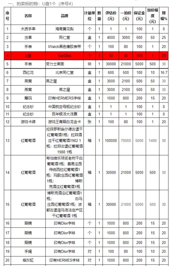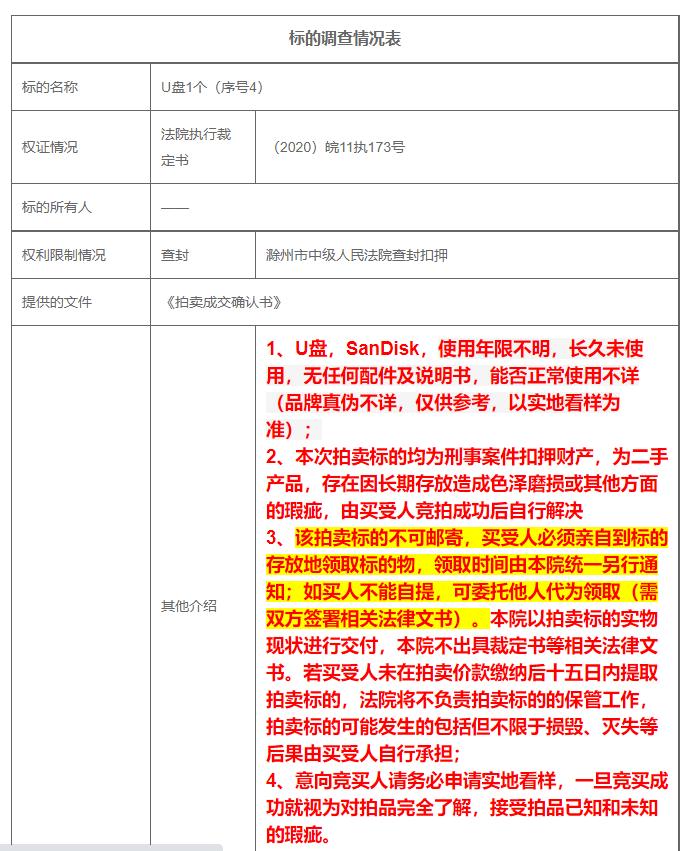 安徽省滁州市中级人民法院在关于被执行人U盘1个(序号4)的公告中称,U盘,SanDisk,使用年限不明,长久未使用,无任何配件及说明书,能否正常使用不详(品牌真伪不详,仅供参考,以实地看样为准)。