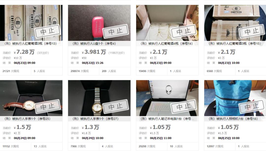每经小编注意到,在拍卖平台上看到,涉及同一份执行裁定书的拍卖物品中,除了大量奢侈品,如印有HERMES、GUCCI、Dior等字样的烟灰缸、手表和眼镜,还有起拍价为1.05万元的镀金镶钻游戏手柄、起拍价800元的索尼PS4游戏机,以及拉菲酒庄干红葡萄酒1982等葡萄酒、海南黄花梨手串等,但这些拍卖物品均已显示中止拍卖。