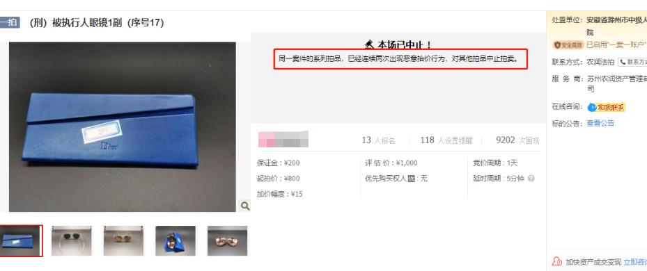 拍卖页面最新信息显示,“由于同一案件的系列拍品,已经连续两次出现恶意抬价行为,对其他拍品中止拍卖。”