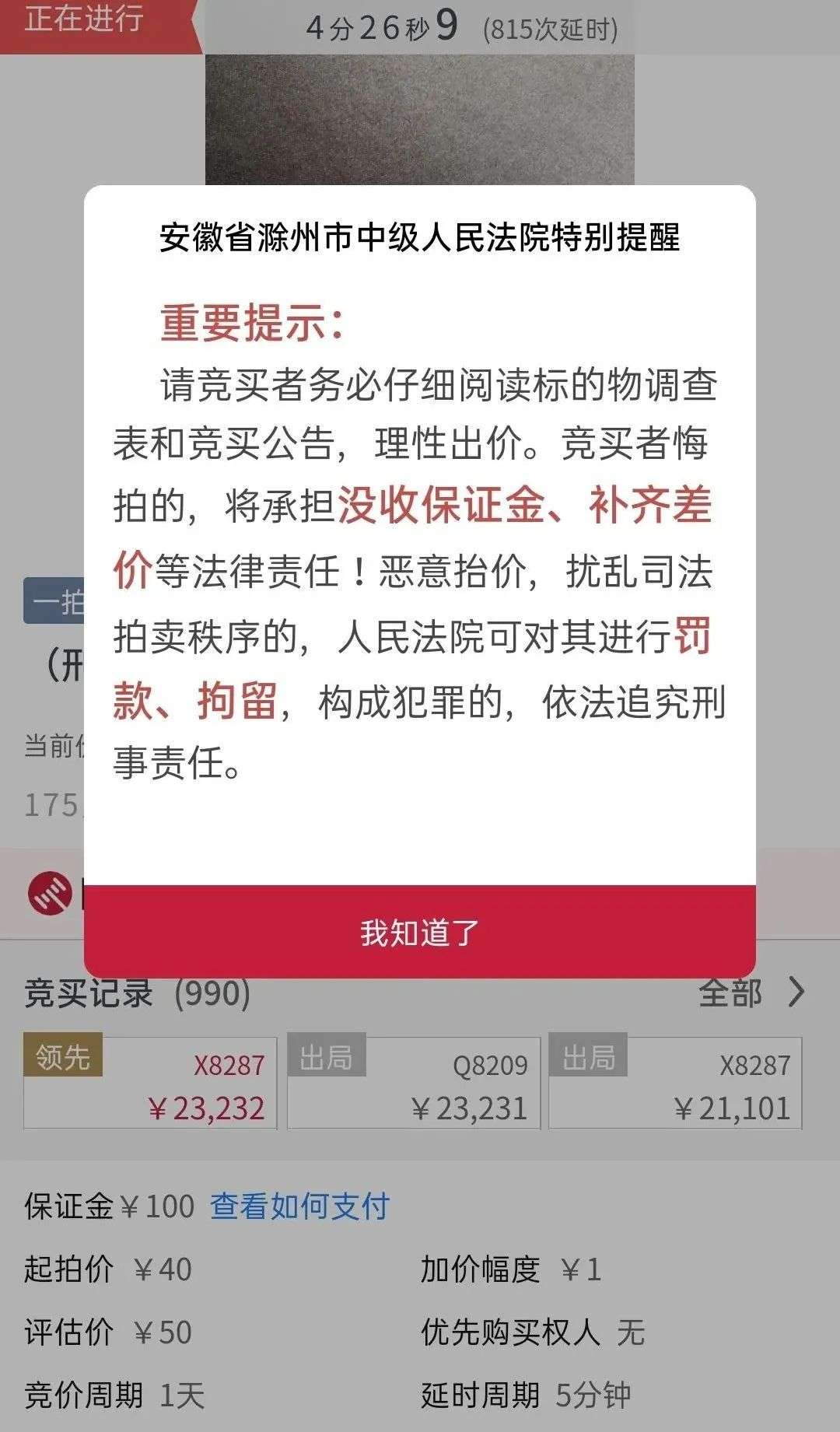在13:35左右,滁州中级人法院曾在拍卖过程中弹出“特别提醒”:请竞拍者仔细阅读标的物调查表和竞买公告,理性出价。竞买者悔拍的,将承担没收保证金、补齐差价等法律责任。恶意抬价,扰乱司法拍卖秩序的,人民法院可以对其罚款、拘留,构成犯罪的,也将依法追究刑事责任。