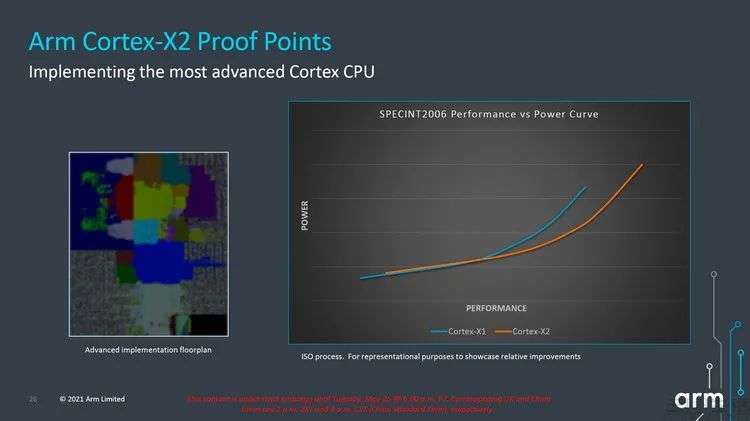 不仅如此,即便从ARM公布的一些“吹水材料”里,我们也能明显看出其最新架构在产品竞争力上的不足。比如说,ARM在宣传刚刚发布的Cortex-X2超大核架构与Cortex-A710大核架构时,都公布了它们与上代产品对比的性能-功耗曲线。然而,从这两张曲线图里可以清楚地看到,在功耗相同的前提下,Cortex-X2和Cortex-A710相比上代其实性能进步的幅度都不算大。