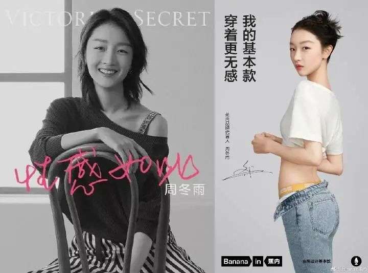 周冬雨同时是维密和蕉内的品牌代言人。前者代表性感,后者主打舒适,但两个品牌在选择代言人时,居然出现了重合。