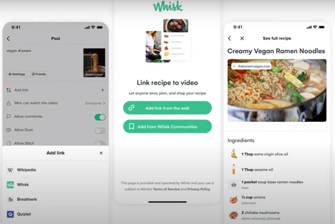 比如说,如果一个用户做了一个美食短视频,他就可以将食谱 App Whisk 的链接嵌入到「TikTok」的短视频当中,这样一来观看者就可以在观看视频了解制作过程之后根据菜谱自己制作。
