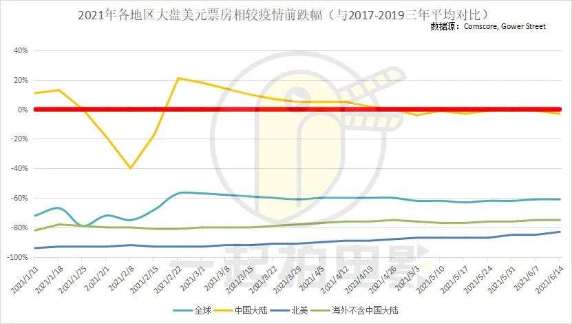 从上表可以看出,虽然上周文章我们提到电影院复工率大幅上涨至80%,但由于严重的片荒问题,票房恢复程度在4月份后就陷入停滞。截至6月中旬,全球大盘票房仅为73亿美元,其中中国内地贡献半壁江山达到40亿美元,北美只产出8亿美元,而海外77市场总计也就25亿美元,这一数据仅相当于正常时段40%水平,若排除中国这个数字将会降低到惊人的19%。