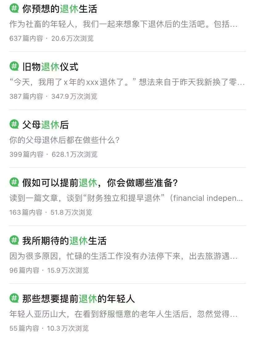 退休是不可能退休的,65岁前是不可能退休的。但即便如此,年轻人仍未放弃提前躺平的梦想,活跃在#你预想的退休生活# #那些想要提前退休的年轻人#等话题里,继续幻想着不工作的美好生活。