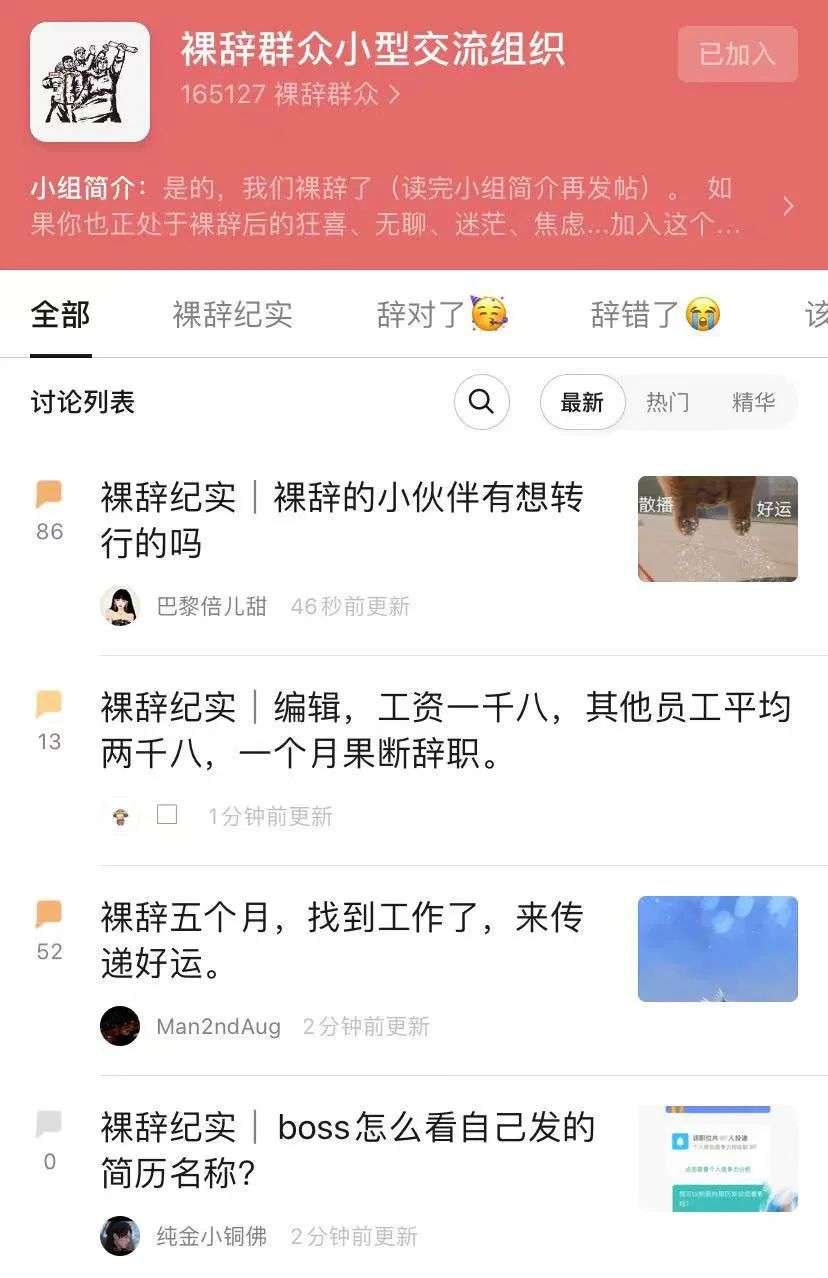 2019年10月,“裸辞群众小型交流组织”(以下简称裸辞小组)在豆瓣正式落地。这座为裸辞青年建起的山头,可供组员分享裸辞经验、讨论未来出路。