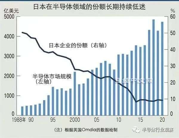 回顾日本半导体的历史,在日本半导体最辉煌的时代,曾独占全球半导体产业约50%的份额。20世纪80年代后期,在世界十大集成电路厂商名单中,美国占3个,日本占6个,韩国1个。日本市场占有率已经超越了美国。随后,美日贸易摩擦逐渐升温,美国24次向日本挥起“301调查”的大棒。一连串的压力面前,日本政府开始退步,相继签署各类条约,按下了日本半导体产业衰退的按钮,后来长期低迷不振。到2019年时,这一比例已经降至10%,曾经最具优势的制造业下降尤其严重。