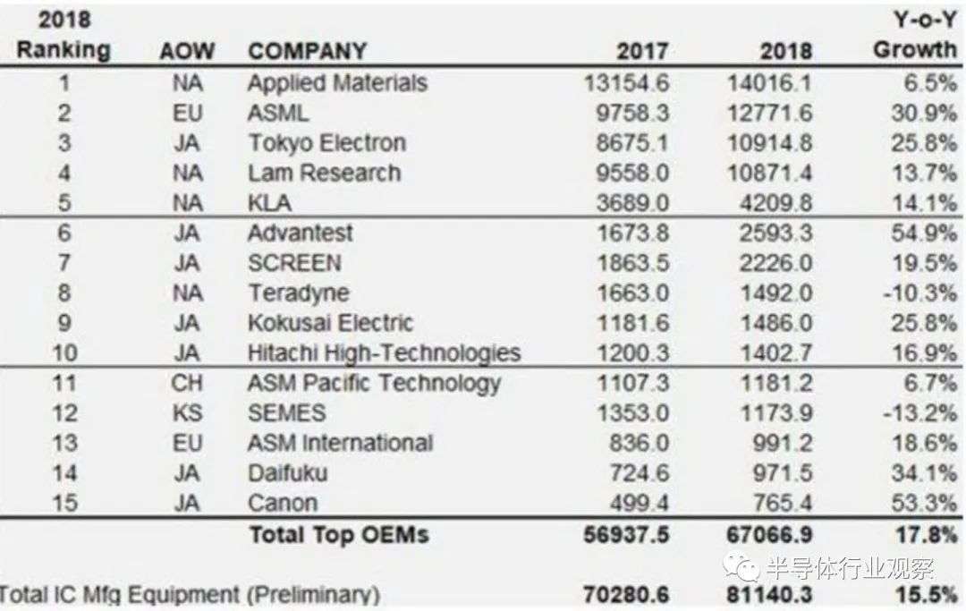 此外,还有很多日本企业在制造设备方面存在优势。2018年,半导体制造设备领域TOP15的企业里几乎有一半是日本企业。