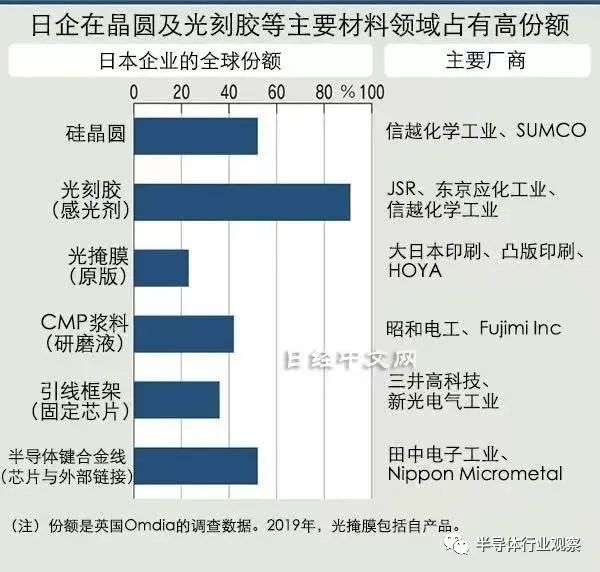 根据上图梳理能够看到,上述企业在基板、光刻胶、材料、设备等领域存在优势。日经中文网数据显示,在作为半导体基板的硅晶圆领域,信越化学和SUMCO两家日本企业占有全球5成以上的份额;在集成电路生产不可或缺的光刻胶部分,JSR及信越化学在内的日本企业所占份额达到9成。昭和电工等企业发力的半导体表面研磨用的CMP研磨液,仅日本企业所占的份额就超过4成。