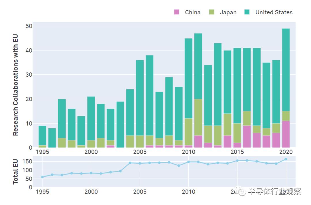 另一方面,随着市场份额减少的还有研发能力的下降:日本的研究能力在过去25年中显着下降。SNV披露的数据中能够看到,日本在IEDM、ISSCC、VLSI三个会议中论文贡献的相对份额在不断降低,从1995年的近40%下降到2020年的不到10%。其次,在论文合作方面,自2016年以来,欧盟与日本的合作论文被中国赶超。