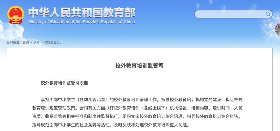教育部成立校外教育培训监管司,承担面向中小学生(含幼儿园儿童)的校外教育培训管理工作。