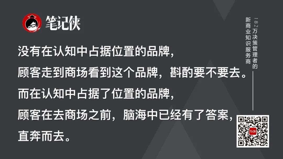 没有在认知中占据位置的品牌,顾客走到商场看到这个品牌,斟酌要不要去。而在认知中占据了位置的品牌,顾客在去商场之前,脑海中已经有了答案,直奔而去。