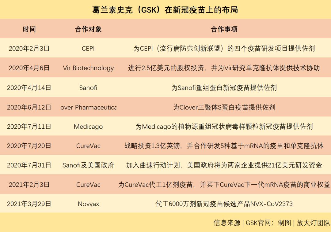 新冠流行伊始,葛兰素史克就做了非常守成而安全的选择:直接绕开原研,选择利用自身优势,为其它公司提供疫苗佐剂。或者,更直接一点,利用资金优势投资疫苗研发企业。