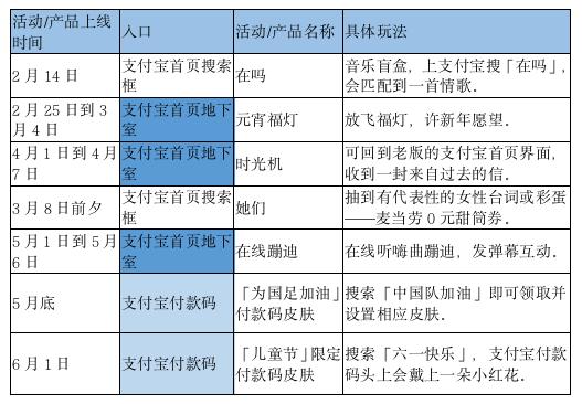 从上表可以看到,过去半年支付宝一直都在“玩”。比如切入点方面,支付宝既会趁着情人节、元宵节、三八节、儿童节等传统节日玩一把,也能赶着国足世预赛披荆斩棘这样的热点事件加入全民狂欢。而入口方面,则是从搜索框玩到「首页地下室」,最近又玩到了「付款码」。