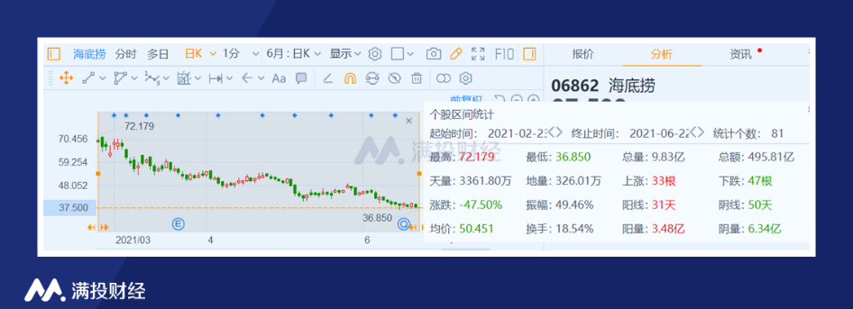 海底捞继上周跌破2000亿市值之后,昨日日股价再度跌超5%,市值跌破2000亿市值大关,四个月市值跌超2500亿港元。