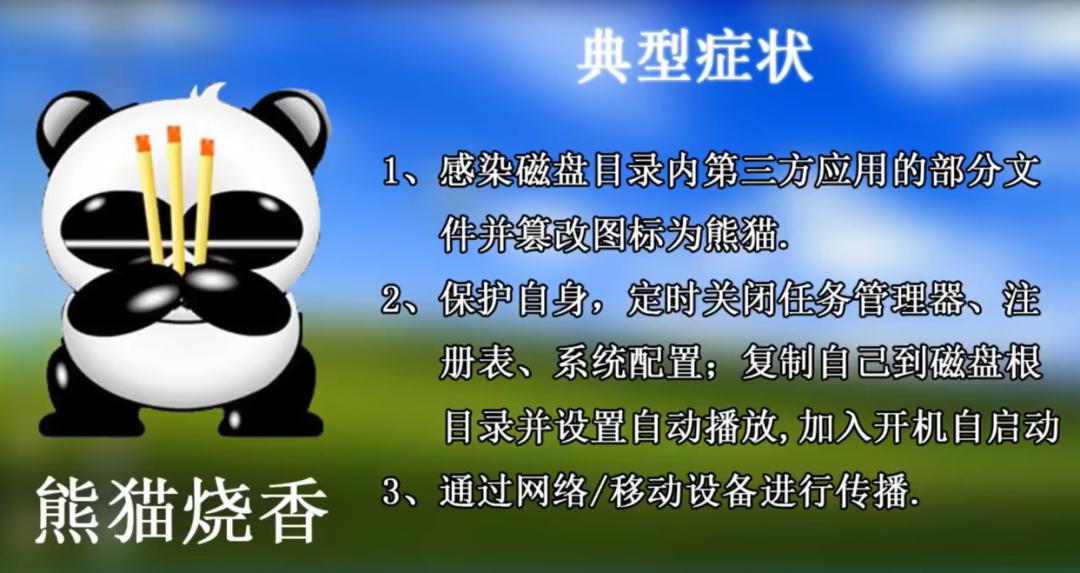 这款病毒的特点是被感染的用户系统中所有.exe可执行文件全部被改成熊猫举着三根香的模样样。