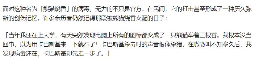 有的网民回忆,许多杀毒软件还没发挥用场,自己就先挂了。