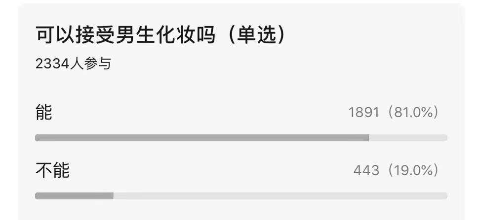 那些现实生活里因为化妆被打击到的男生,在豆瓣小组里总能找到安慰“我不歧视,反而看到会化妆的男生很羡慕,毕竟本人手残。”两年前就有人在这里发起“可以接受男生化妆吗”的投票,81%的人都选择能接受。