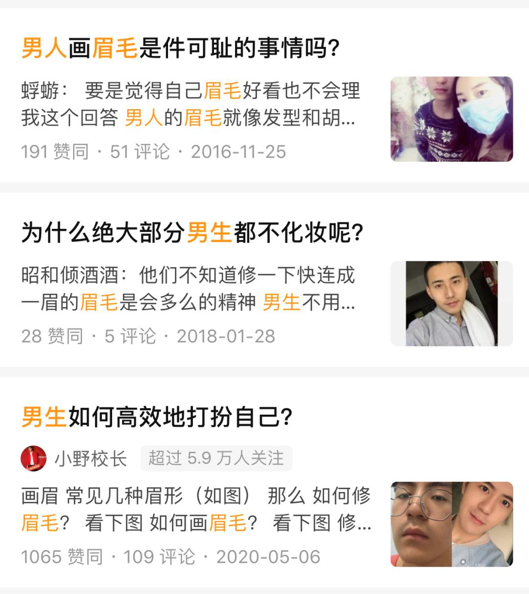 毕竟纹眉也算医美范畴的小手术,又是表面麻醉、又是术后护理,曾经只是女为悦己或者悦己者容的手段,现在男生的接受度也越来越高。变化在知乎上肉眼可见,2016年的问题是“男生化眉毛是件可耻的事吗?”到2020年已经进化到“男生如何高效地打扮自己。”。