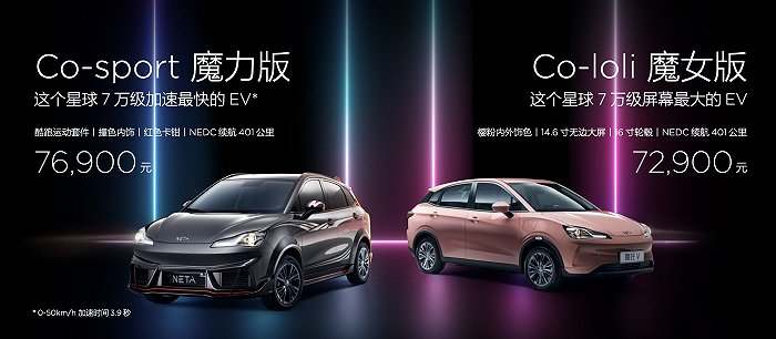6月22日,合众新能源汽车有限公司旗下独立子公司哪吒汽车推出三款全新“用户定义系列”车型。其中哪吒V Co-sport 魔力版号称“7万级加速最快的电动汽车”,定价76900元;哪吒V Co-loli 魔女版则定位“7万级屏幕最大的电动汽车”,价格72900元。