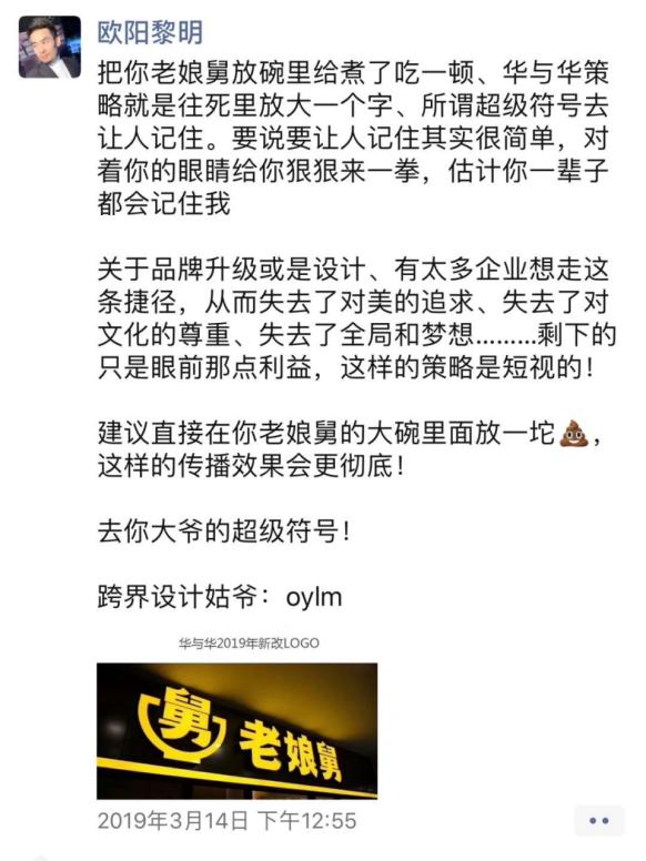 2019年初,华与华替餐饮品牌老娘舅进行了一次品牌升级,结果引来了一场不小的骂战,国内著名设计师欧阳黎明公开在朋友圈炮轰,”去你大爷的超级符号!”
